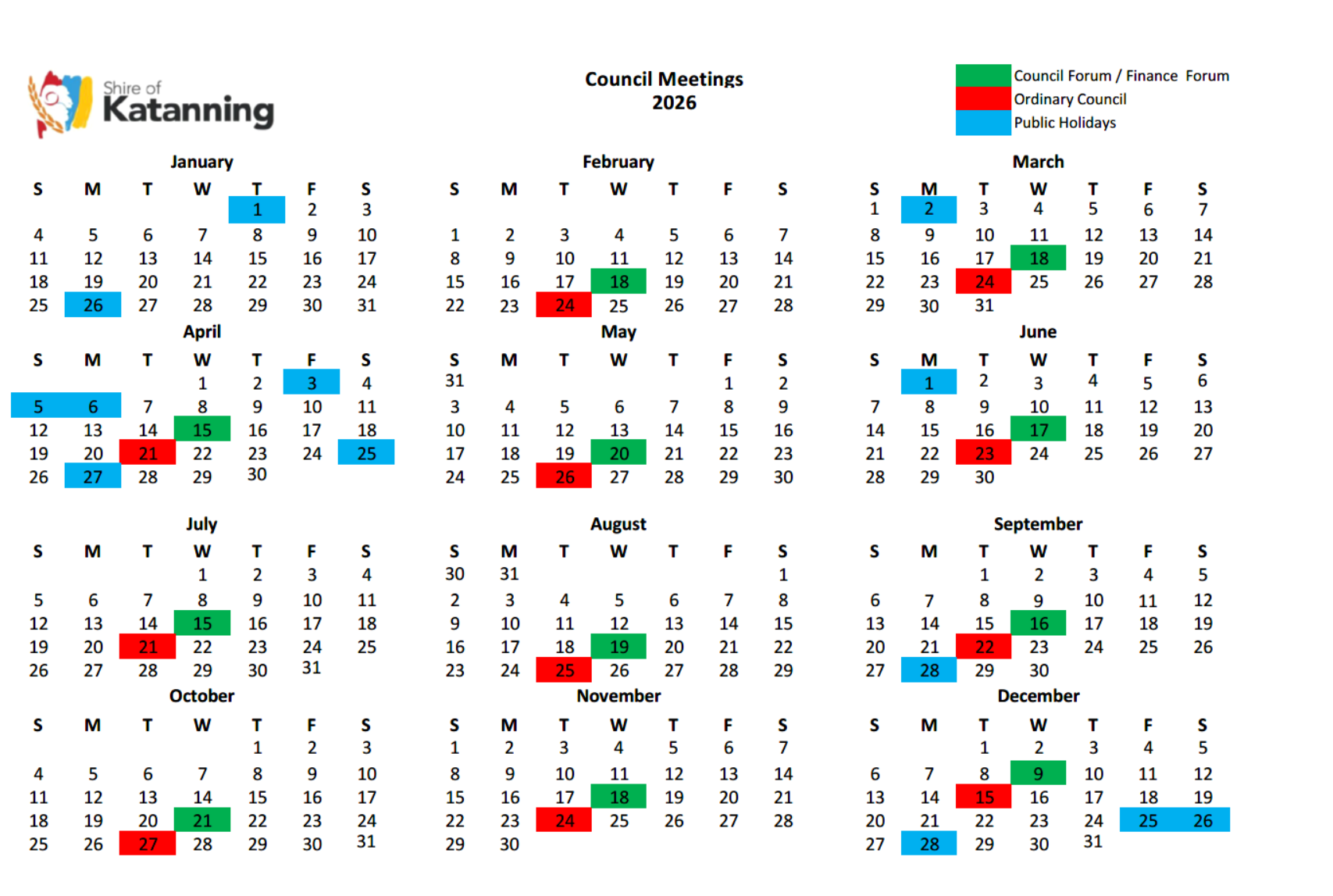 Ordinary Council Meetings for 2025 are held every fourth Wednesday of the month (unless otherwise advertised). The Meetings are held in the Shire of Katanning Administration and Civic Centre, Council Chambers located at 52 Austral Terrace Katanning, commencing at 6:00pm. The agenda is made available at least 72 hours prior to the meeting.