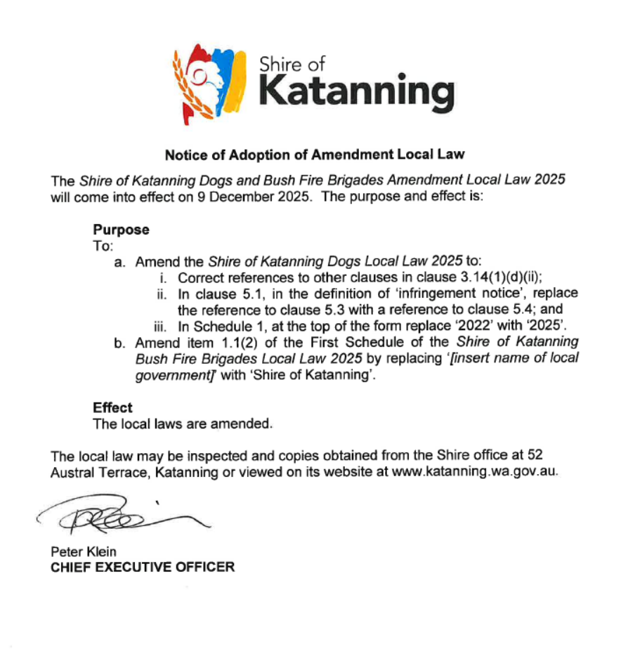 Notice of Adoption of Local Law - Shire of Katanning Dogs and Bush Fire Brigades Amendment Local Law 2025